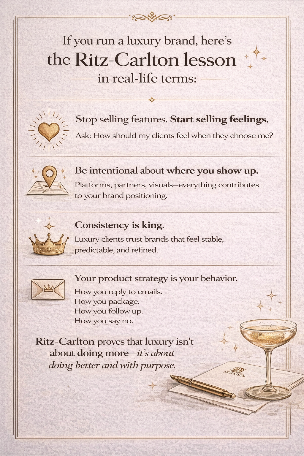 Nothing is left to chance, because luxury is intentional. Even if you sell clothes, services, or experiences, your real product is an emotional outcome.